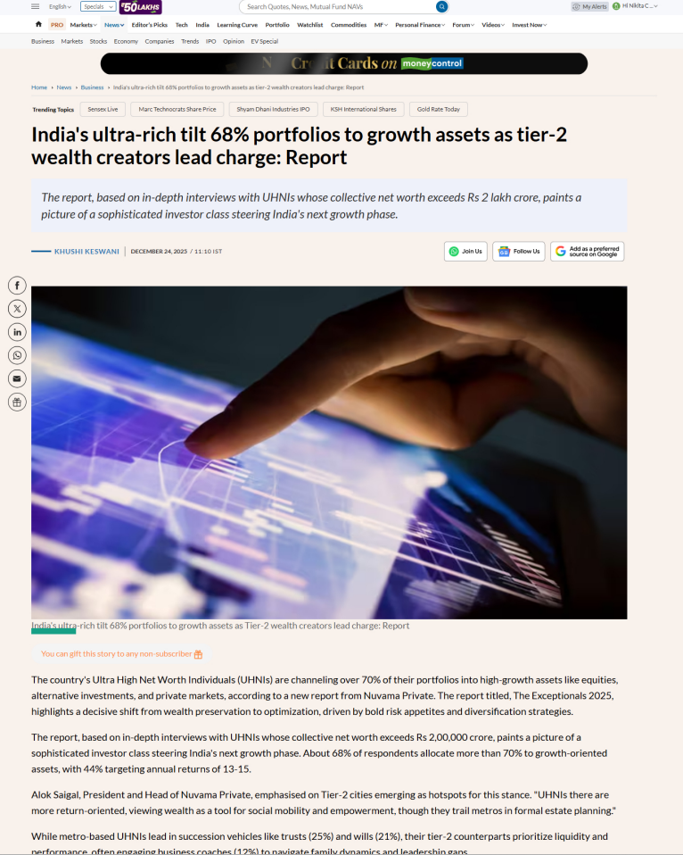 The country's Ultra High Net Worth Individuals (UHNIs) are channelling over 70% of their portfolios into high-growth assets like equities, alternative investments, and private markets, according to a new report from Nuvama Private. The report titled, The Exceptionals 2025, highlights a decisive shift from wealth preservation to optimization, driven by bold risk appetites and diversification strategies.
